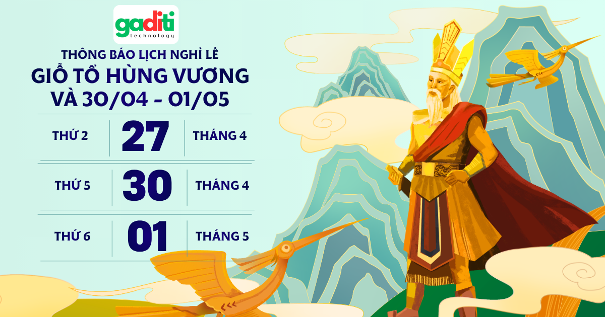 Theo quy định của Nhà nước về việc nghỉ các ngày Lễ trong năm 2026, GADITI trân trọng thông báo lịch nghỉ lễ Gỗ tổ Hùng Vương, Giải phóng Miền Nam 30/4 và Quốc tế Lao động 1/5 như sau: