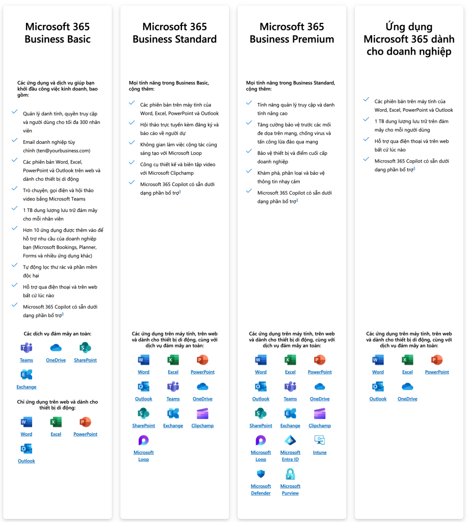 Bảng so sánh các phiên bản Microsoft 365